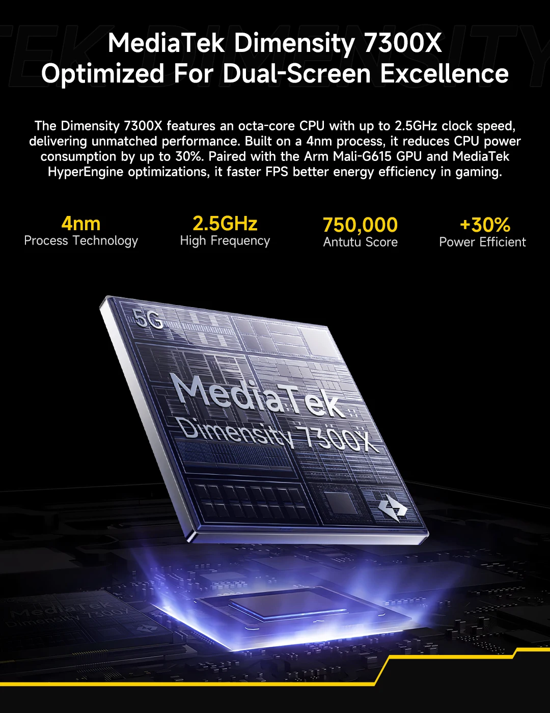 Performance is driven by the MediaTek Dimensity 7300X chipset, built on an advanced 4nm process for efficient power consumption and smooth operation. Its octa-core CPU—featuring four Arm Cortex-A78 cores up to 2.5GHz and four Cortex-A55 cores—ensures responsive multitasking, while the Arm Mali-G615 MC2 GPU (1100MHz) handles graphics with ease. Enhanced AI capabilities come from the MediaTek NPU 655, enabling faster, smarter on-device processinag.